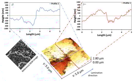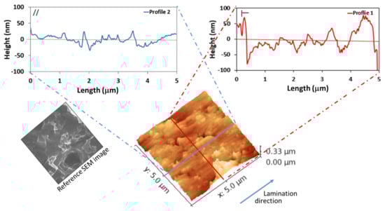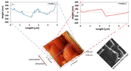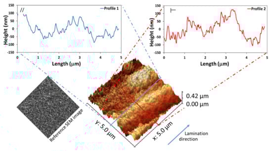 Figure 4 shows the roughness profiles and the AFM map of the Al-FS sample. The visual 3D AFM map shows a surface morphology quite compatible with the SEM images (Figure 1b). In addition, the difference between the longitudinal and transverse profiles persisted somewhat, although topologically the surface profiles in the two directions were similar. In fact, the full gap between the peaks and valleys in the opposite lamination direction was around 1400 nm. Instead, in the lamination direction, this gap was about 1000 nm.