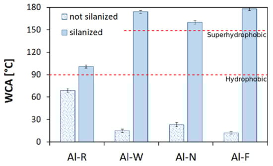 In order to better relate the surface behavior to the different treatment methods, the water contact angle (WCA) was measured for all batches (Figure 6); as a reference, the hydrophobicity and superhydrophobicity threshold values were also drawn (dotted red lines).