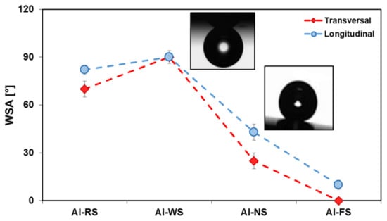 Another parameter which allows for the assessment of the wetting behavior of textured surfaces is the water sliding angle. The sliding angle is a measurement of the interaction of the liquid with the surface and is related to the extension of the “wetted” surface area, independent of the hydrophobic behavior, i.e., we can have a hydrophobic surface with high sliding angle (rose petal effect) and a hydrophobic surface with a low sliding angle (lotus effect). Measurements were obtained along both the longitudinal and transversal directions (Figure 7). It is interesting to note that all the samples before silanization (Al-R, Al-N, Al-W, and Al-F) showed a high WSA (90°) (data not reported in Figure 7). While the Al-WS surface showed a WSA > 90° typical of the pure Wenzel state, the Al-FS surface conversely showed a very low WSA almost near to zero, typical of a pure Cassie–Baxter state. An intermediate behavior was observed for the Al-NS surface.
