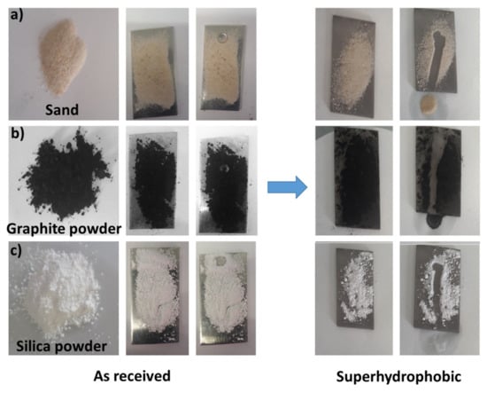 A low WSA is fundamental to promote the self-cleaning capability of a surface. A self-cleaning behavior is required for several applications in areas such as textiles, cotton-fabric garments, building construction, lavatories, domestic automobile windows, architectural heritage, and photovoltaic and solar cells [24,27,28,38,49]. Self-cleaning capability can be easily evaluated by a practical water rolling test on randomly spread powder on the superhydrophobic surface. Numerous types of powder as a model dust/contaminant were used (sand, graphite powder, and silica, Figure 8). The powders were distributed on the superhydrophobic surface of the best performing sample (AL-FS), then exposed to water droplets using a disposable syringe. When the water droplets encountered the powder particles, all the types of powder were picked up almost instantaneously and rolled off, leaving a clean surface and confirming the potential suitable self-cleaning capability of this superhydrophobic coating.