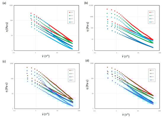 Viscosity curves of hot trubs as a function of shear rate at four temperatures: (a) hot trub from wort, 12.5° (70% malted + 30% unmalted barley); (b) hot trub from wort, 14.1° (100% malted barley); (c) hot trub from wort, 16.1° (55% malted + 45% unmalted barley); (d) hot trub from wort, 18.2° (55% malted + 45% unmalted barley).