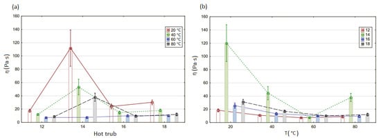 In addition, the hot trub also showed yield stress. The highest values of τ0 were also observed for hot trub 14 and the lowest one for hot trub 12. Hot trubs 16 and 18 had very similar yield stress values. Similar to the maximum viscosity, the yield stress decreased with increasing temperature but increased at 80 °C. The highest reductions in τ0 values were recorded at 60 °C, by 60–75% of the value at 20 °C. At 80 °C, the yield stress value was 30–40% lower than that at 20 °C. Only for hot trub 14 were the τ0 values at 60 °C and 80 °C over 70% lower than those at 20° C.