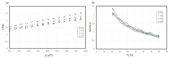 In the investigated suspension, the hot trub constitutes 24% and the remaining is wort. Wort is a Newtonian fluid (Figure 4a). The highest value of viscosity was found for wort 18 (2.5 mPa·s), while the lowest was for wort 14. It is worth noticing that wort with higher extract (14.1° P) had a lower value of viscosity (2.1 mPa·s) than wort with extract of 12.5° P and viscosity of 2.2 mPa·s. It is a small difference; however, it is consistent with other studies of the influence of unmalted grain on the viscosity of wort []. Wort 16 had a viscosity of 2.3 mPa·s. Figure 4b presents changes in viscosity with temperature. Temperature change from 20 to 80 °C caused a drop in viscosity value to, on average, 0.7 mPa·s.