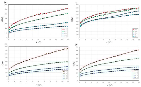 We have attempted to describe the experimental data using one of the rheological models available in the literature. The best fit was determined through the highest value of R2. The Marquardt–Levenberg minimization procedure was used for the estimation of the parameters of the selected model []. Target function was formulated as: