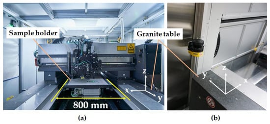 The measurements were performed in a walk-in microSHAPETM machine (3D-Micromac, Chemnitz, Germany), which has an XHE 200 W (Amphos, Aachen, Germany) laser system. A photo of the interior of the system is shown in Figure 1.