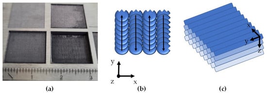 (a) The 15 × 15 mm2 scan areas after USP-laser processing with the microSHAPETM machine at peak intensities of 1 × 1015 W/cm2 and above (see Table 1). The visibly different depths of the processed areas are caused by different numbers of processing steps and variations of the laser pulse energy. The square in the top left corner was processed at PTB with a much smaller peak intensity of 3.0 × 1014 W/cm2. (b) Schematic of the 2D bidirectional laser spot movement with respect to the coordinate system as given in Figure 1. In (c), multiple processing layers in the z-direction are indicated.