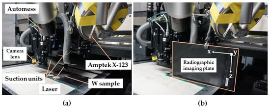 For monitoring the homogeneity and the location of higher concentrations of emitted X-rays during USP-laser machining, a 2D Radiography Scanner CR 35 NDT Plus system from DÜRR (Stuttgart, Germany) [27] was used. As shown in Figure 3b, the radiographic plate could be placed adjacent to the tungsten sample, around 10 cm away from the laser-induced plasma and just outside the safety monitored area.