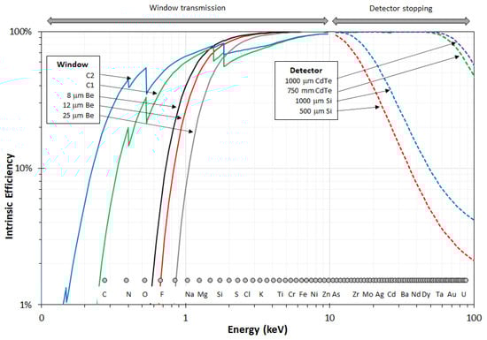 Comparison of the intrinsic efficiency of the X-123 detectors from Amptek. At low energies, the Be window limits sensitivity, and the 1 mm thick CdTe crystal (dashed violet curve) has a good efficiency up to 70 keV. © Amptek Inc 2021. Reprinted with permission.