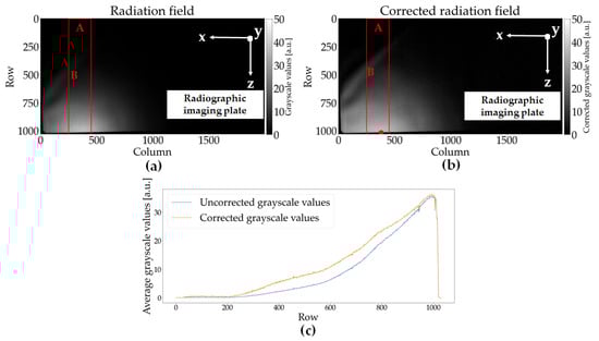 where G(r0) is the corrected grayscale value at the reference distance r0 (in this case, the shortest distance of 10 cm), and G(r) is the measured grayscale value at a distance r. The distance r of each grayscale value can be calculated from the row and column position (u, v) on the imaging plate, r0 and the row and column values (u0, v0) of the reference distance on the grayscale image (in this case (u0, v0) = (371, 1021)), and the pixel pitch p.