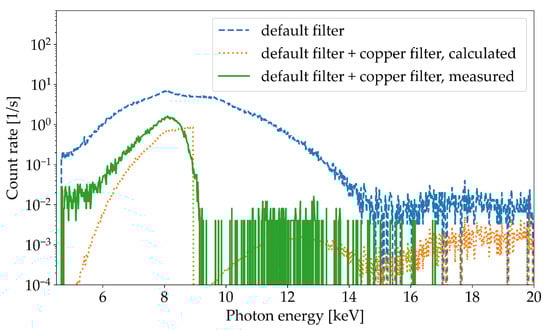 Moreover, for comparison, the expected spectrum after transition of a 50 µm thick copper filter was calculated. This calculated spectrum (orange curve in Figure 6) is based on the measured spectrum without a copper filter (blue curve) multiplied by a transmission function T(E, d) in each energy channel. The function T(E, d) describes the exponential attenuation of photons traversing a material [28] and is given by