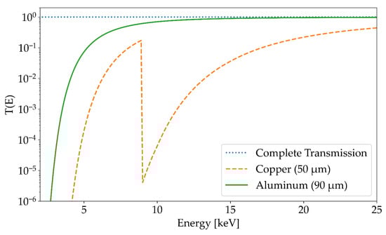 where d and ρ are the thickness and density of the material (in this case 50 µm of copper foil), respectively, and µ(E)/ρ is the energy-dependent mass attenuation coefficient of the material. For the calculation, the list of mass attenuation coefficients from the National Institute of Standards and Technology was used [28]. These tabulated values were logarithmically interpolated to obtain a corresponding value of the mass attenuation coefficient for each energy channel of the Amptek X-123 spectrometer. The T(E, d) for 50 µm of copper and 90 µm of aluminum as a function of the photon energy, together with the curve for no attenuation, i.e., T(E, d) = 1, is depicted in Figure 7.