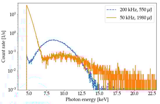 Figure 8 shows the comparison of the X-ray emission spectra for a fixed average laser power but two different combinations of pulse energy and repetition rate configured in the microSHAPETM USP-laser machine. The first measurement (orange curve) took place at a laser repetition rate of 50 kHz and a laser pulse energy of 1980 µJ, while the second measurement (blue curve) was carried out at a laser repetition rate of 200 kHz and a laser pulse energy of 550 µJ. The respective laser peak intensities of the laser pulses were 3.3 × 1015 W/cm2 and 0.9 × 1015 W/cm2. To be able to compare the measurements as plotted in Figure 8, the number of photons (counts) per channel with an energy bandwidth of 20 eV was divided by the accumulation time in seconds of each experiment.
