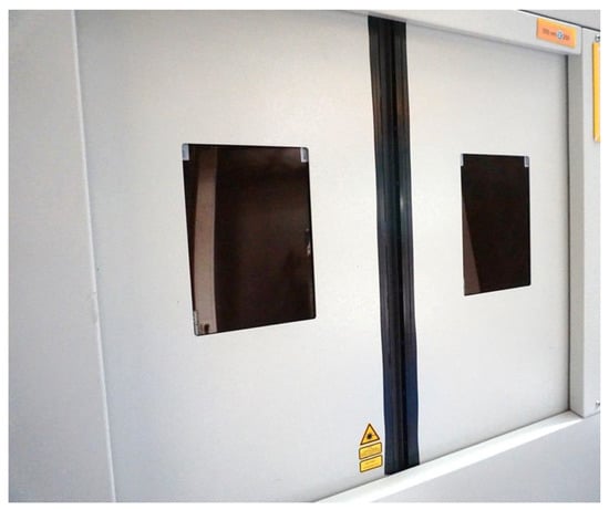 The second setup with the Coherent laser was selected for further measurements because of the distinctive features of the 2 mm steel protection housing. It has an opening station comprising two doors with windows made of PMMA polymer covered by a thin aluminum layer (see Figure 9). Additionally, in a small slit region where the two doors join when closed, rubber material without any additional steel or aluminum layers is located. In this region, transmission of X-ray radiation is much less suppressed when compared to the surrounding steel protection housing.
