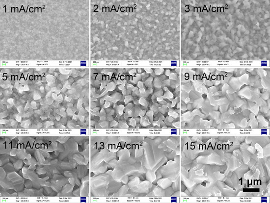The thicknesses of the Bi films are 92, 168, 266, 472, 632, 768, 892, 1012 and 1144 nm for the current densities of 1, 2, 3, 5, 7, 9, 11, 13 and 15 mA/cm2, respectively. The SEM images taken at the same magnification of the Bi films electroplated with different current densities (Jc) at 30 °C for 2 min are shown in Figure 1, and the morphology changes obviously as the Jc rises. When the Jc is 1 mA/cm2, the Bi film shows compact grains with a small grain size and there is no obvious crystalline structure. The grains begin to grow and show a polyhedral structure as the Jc rises to 2–3 mA/cm2. As the Jc rises to 5–15 mA/cm2, the grains show a similar granular morphology with well-defined crystals and grow to an anisotropic rhombohedral structure [20]. Thus, Jc does have a significant influence on the grain structure of Bi films. The average grain sizes of Bi films are calculated by counting the grain size from the SEM images and are shown in Figure 2. As the Jc increases, the grain size becomes larger.