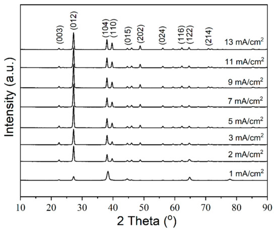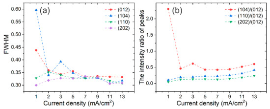 Figure 4 shows the full width at half maximum (FWHM) and the intensity ratio of the peaks obtained from the XRD patterns. The FWHM of the main peaks do not change a lot as the Jc > 2 mA/cm2 (Figure 4a). The intensity ratio of (104)/(012), (110)/(012) and (202)/(012) increases slowly when the Jc is > 5 mA/cm2 (Figure 4b).