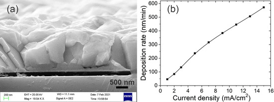 The SEM image of the cross-section of the Bi film electroplated with 9 mA/cm2 at 30 °C for 2 min (a) and the deposition rate of Bi films vs. current density (b).
