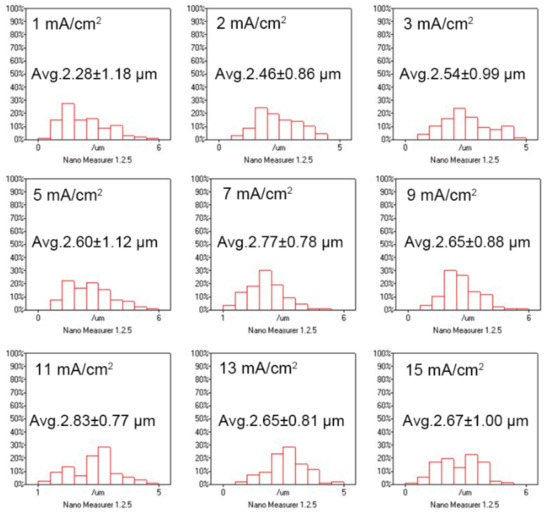 To investigate the impact of the thickness of the Bi film on the grain size, 5 μm Bi films are electroplated at different current densities. As shown in Figure 6, the grain sizes are 2.28, 2.46, 2.54, 2.60, 2.77, 2.65, 2.83, 2.65, and 2.67 μm for the current density of 1, 2, 3, 5, 7, 9, 11, 13, and 15 mA/cm2, respectively. As the current density is > 3 mA/cm2, the grain size does not change obviously. Compared with the Bi films electroplated with the same current density at 30 °C for 2 min, the grain size increases obviously with the increasing film thickness.