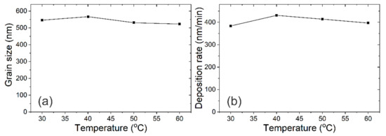 Average grain size obtained from SEM images (a) and the deposition rate vs. the electroplating temperatures (b).