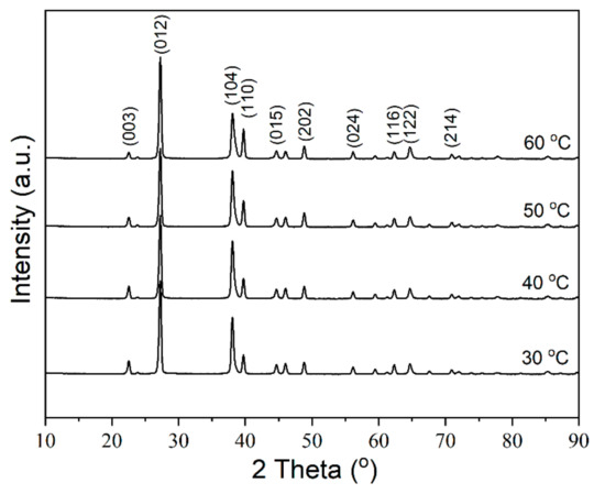 However, the preferential orientation of the Bi grain changes as the temperature rises, as shown in Figure 9. All the samples exhibit the significant peaks around 2θ at 27.1°, 37.9°, 39.6°, and 48.7°, which are assigned to the (012), (104), (110), and (202) reflections of Bi crystallites. Figure 10 shows the FWHM and the intensity ratio of peaks obtained from XRD patterns. The FWHM of the (012), (110) and (202) decrease with a small scale as the temperature rises and the FWHM of the (104) increases as the temperature rises (Figure 10a). The intensity ratio of (104)/(012), (110)/(012), (202)/(012) increases with the temperature before 50 °C and decreases at 60 °C. The electroplating temperature obviously affects the orientation of the Bi grains.