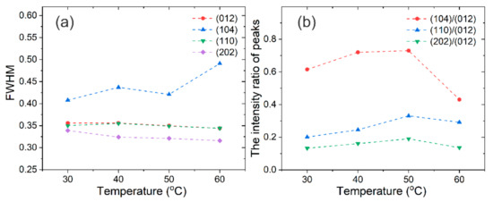 The FWHM of the main peaks (a) and the intensity ratio of peaks (b) obtained from XRD patterns.