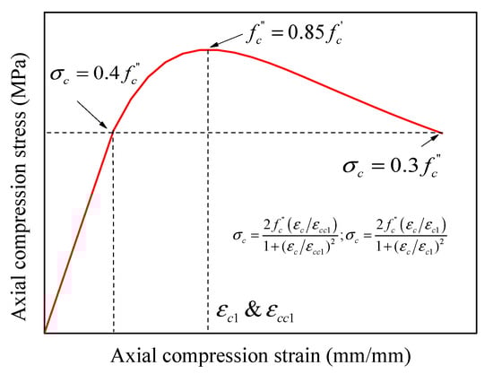 The plastic behavior of concrete as defined by ABAQUS User Manual 6.14 [49], considers five parameters of concrete as follows: the dilation angle (ψ), the viscosity parameter, the eccentricity (ε), the ratio of biaxial to uniaxial stresses (σbo/σco) [65], and the shape factor of yielding surface (Kc) (see Table 4). All these factors were calibrated to obtain the best results as compared with the test measurements. To calculate uniaxial compressive stresses of concrete (σc), Equation (2) was proposed in the current research, mainly based on models provided in the literature (i.e., [77]) but with some modifications to account for unconfined and confined concrete as reported by Zeng et al. [78] (i.e., Equation (4)). For the definition of compressive behavior of concrete, the compressive stiffening model (Equation (2)) is presented in Figure 3 for a selected specimen.