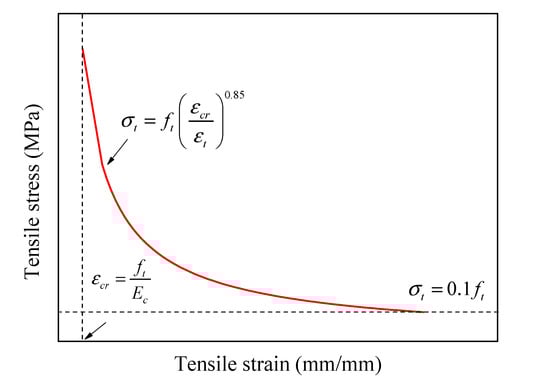 where εocel and εotel are the elastic strains of concrete under compression and tension stresses and calculated respectively as εocel = σc/Ec and εotel = σt/Ec. Figure 5 finally defines the behavior of unconfined concrete under tensile loads (Equation (12)) [84]: