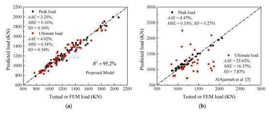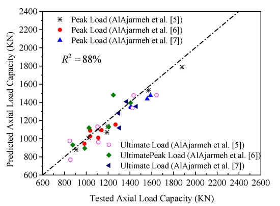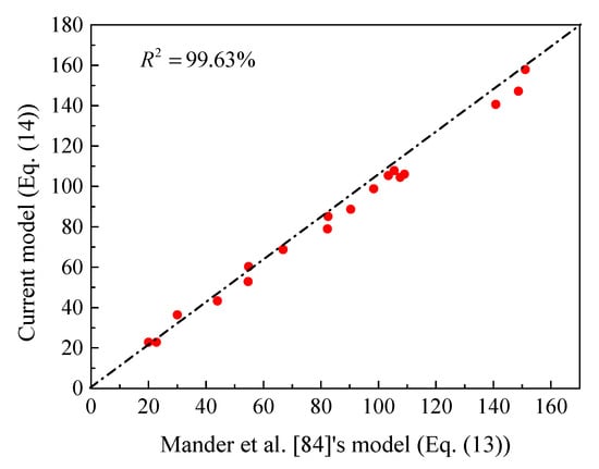 Similarly, the strain of confined concrete at ultimate can be determined using Mander et al.’s [92] model (Equation (18)). It is to be noted that the unconfined concrete strain of 0.002 in their model was taken in the current model to be equal to the predicted εc1 value (Equation (3)). Moreover, to account for the effective confined concrete core of spirally reinforced HCCs as in the present paper, Equation (19) was suggested, based on the test results of all 60 specimens provided in Table 2. The test results of the 17 specimens tested in [5,6,7] were taken as a major control in the model development. An excellent correlation was finally obtained between the existing and currently proposed expressions (see Figure 7):