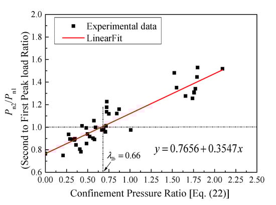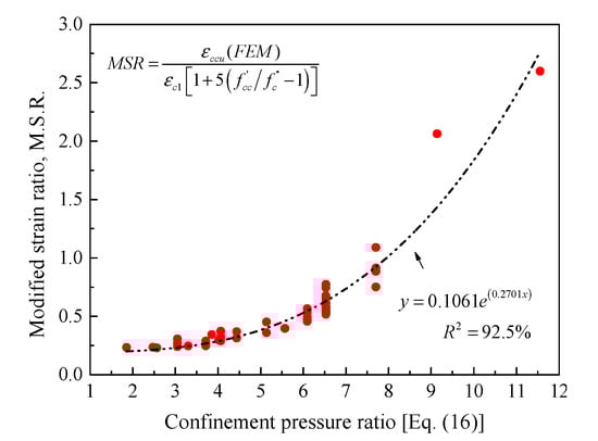 The confinement made by the FRP spirals provides enhancements in the compressive strength and deformation of concrete [85]. This enhancement is usually higher at ultimate than that at peak condition resulting in a hardening stress-strain behavior for sufficiently confined concrete [86,87,88,89,90,91,92,93,94,95,96,97,98,99,100,101]. As the final failure was due to ruptures in the longitudinal GFRP bars and crushing of the concrete core at mid-height without damage to the lateral spirals [5,6,7], the confinement strength model proposed by Mander et al. [92] (represented by Equation (13)) was, therefore, used to exactly capture the compressive strength of confined concrete core (fcc’) obtained from the FE simulations. In case of exceeding the range of test parameters that were used to build Mander et al.’s [92] model, Equation (14) was herein introduced to have a different form. Finally, an excellent calibration between these two expressions is revealed by Figure 6: