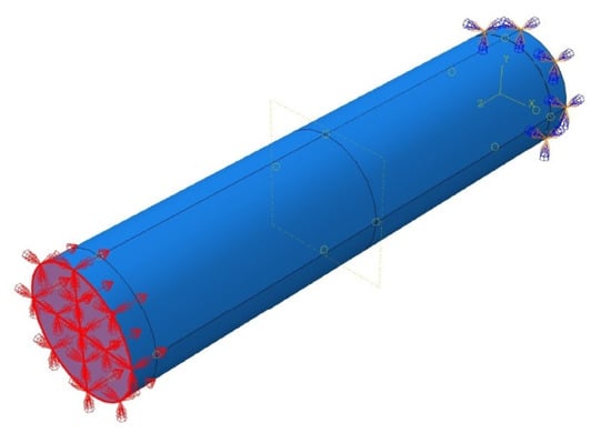 The column specimens in the present simulations were tested with deformable 3D steel end plates. The boundary conditions chosen for these end plates are clearly shown in Figure 8. The material was considered steel with linear elastic behavior. The linear elastic behavior of the steel plates was, in the present paper, defined in terms of density (7.8 × 10−9 ton/mm3), elastic tensile modulus (Es = 200,000 MPa without any yield limit), and Poisson’s ratio of 0.30.