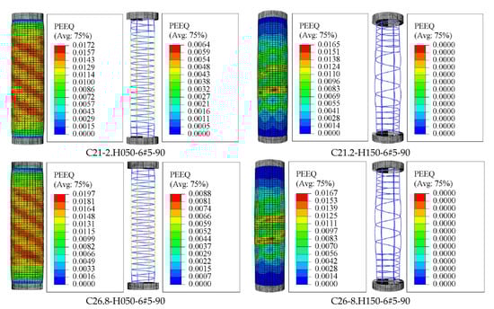 Figure 10 shows the results of selected simulated specimens with different concrete compressive strength and spiral spacing. These presented results were recorded when the damage in the concrete starts to occur (i.e., in this regard, the dc result is close to 0.7 for all test specimens). The results of Figure 10 declare that the effectiveness of confinement of FRP is usually limited by the buckling of longitudinal GFRP rebars. The results show that constructing columns with a larger spacing of the lateral reinforcing bars reduced the efficiency of concrete-core confinement and cause a global buckling for the longitudinal bars, i.e., C21-2-H150-6#5-90 and C26-8-H150-6#5-90, which exhibited no inelastic deformation in the reinforcing bars. The smaller spiral spacing reveals greater inelastic deformation which results in fracture of the longitudinal rebars, i.e., C21.2-H050-6#5-90 and C26.8-H050-6#5-90. Moreover, the GFRP spirals remained without any damage in all the experimental tested columns [7], and this can be seen from the results of Figure 9 and Figure 10.