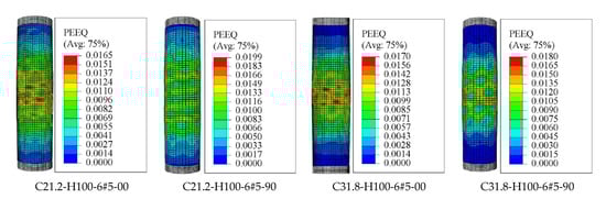 According to the tests in [7], the failure in all columns started as vertically spreading hairline cracks appearing on the outer concrete surface at advanced loading levels. Once they appeared, the cracks propagated and widened, leading to different spalling features of the outer concrete cover, rupturing longitudinal GFRP bars, and damaging the concrete core. The different features of the column’s failure were mainly dependent on the effect of the column parameters. For example, specimen C26.8-H00-6#5-90 without internal GFRP confinement experimentally experienced explosive spalling and failing of both the concrete cover and core, causing large concrete pieces to fall from the specimen at column’s mid-height. Figure 9a reveals close agreement between the failed region and the global buckling of the longitudinal GFRP bars that obtained from the FEM as clearly indicated by the zero PEEQ value recorded at column’s mid-height: PEEQ values (the material’s inelastic deformation) are corresponding to the FEM failure of concrete. On the other hand, for confined specimen, gradual overall concrete-cover spalling was observed, followed by lateral expansion in the concrete core, which was confined by the GFRP spirals. The rupture of the longitudinal GFRP bars in different locations throughout the column’s height then occurs, i.e., C26.8-H50-6#5-90 in Figure 9b, in which the PEEG values are higher compared with the unconfined specimen.