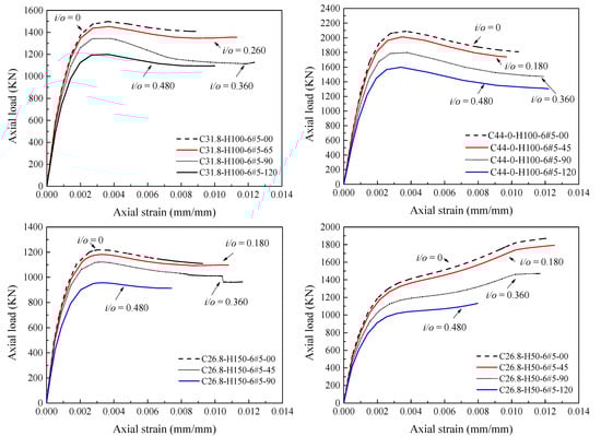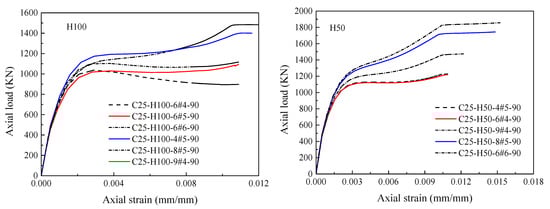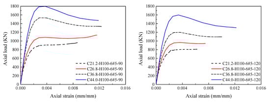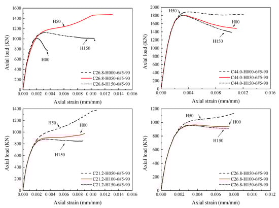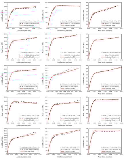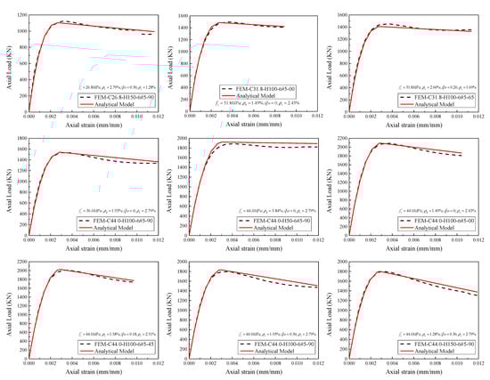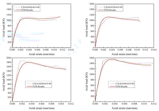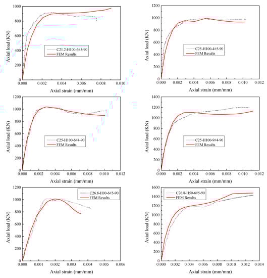 Figure 13 represents the comparison of the complete load-strain responses of HCCs obtained from experimental and numerical results. The HCCs show different types of failure behavior: a softening behavior with one peak load (i.e., C26.8-H150-6#5-90) with a ductility factor of 1.5 and ductile behavior (i.e., C26.8-H50-6#5-90) with a two-peaks’ failure mode with a ductility factor of 2.1 comparing with the C26.8-H00-6#5-90 with no GFRP confinement. Overall, the axial load-strain responses of the finite element model agree well with the tested responses. Although there are some discrepancies between the experimental and numerical stress-strain responses (i.e., C25-H100-9#4-90), the comparison in Figure 14 showed a satisfactory correlation between the experimental and numerical axial capacities in pre-peak and post-peak zones.