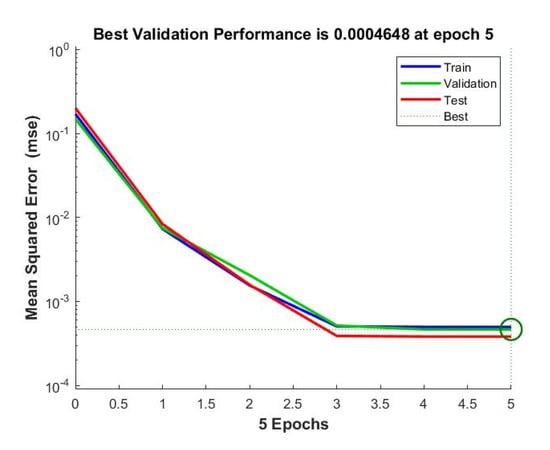 Once the ANN model is built and the first and last data layers are chosen and normalized, the network can now be trained. Based on the overall model performance and the least mean square error achieved across a wide range of training parameters, the optimal number of hidden nodes was found to be 3 and the learning rate was close to the range of 0.005–0.01. Using these resulted parameters in a training approach, the most accurate results can then be obtained. Figure 15 clearly shows such a result for the train, validate, and test data, which have almost similar mean square errors. The predictions from the ANN model are practically generated following the Equations (26)–(32).