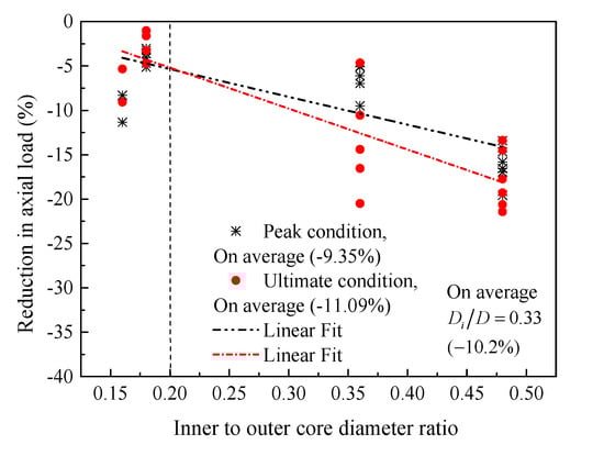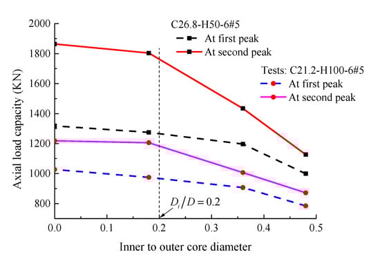 Moreover, one of the major aspects influencing the seismic capacity of HCCs is the aspect ratio (length to cross-section depth). The failure pattern and the mechanical performance of the hollow concrete-core columns depend on the effect of the amount of longitudinal reinforcement [22,23]. Various researches examine the mechanical performance of HCCs with internal steel bars under different loading conditions [18,19,22,23,24,25,26,27,28]. These studies concluded that the structural behavior of HCCs depends on the ratio of inner to the outer diameter of the HCCs (Di/D), axial-loading ratio, amount of longitudinal reinforcement, and the amount of the lateral confinement. Furthermore, when the Di/D was increased while keeping the other variables constant, the ductility of steel-reinforced HCCs was decreased. Due to the brittle failure of HCCs under shear stresses, a sudden decrease in the axial compressive strength capacity occurred at the ultimate condition [29,30]. The reduced axial compressive strength was more prominent for the HCCs with larger inner-to-outer concrete-core diameter ratios [18,20]. Due to buckling failure and limited axial strains of steel, the axial performance of HCCs was not examined in the post-loading stage. Instead, when the steel bars start to buckle, the crushing of concrete material occurs [16,31,32].