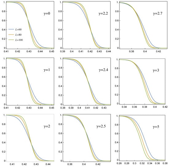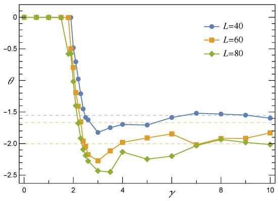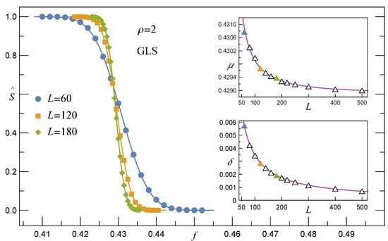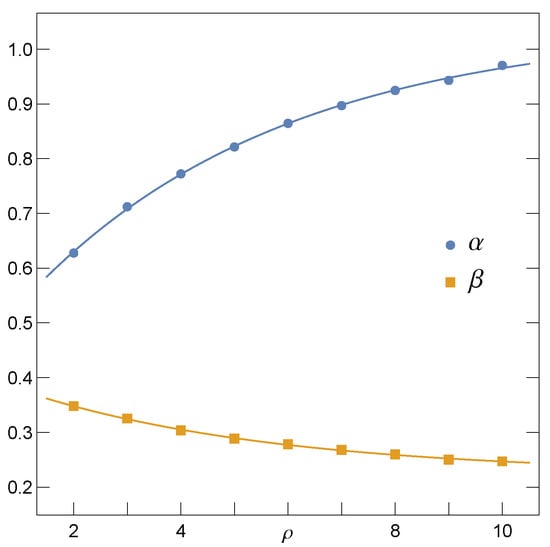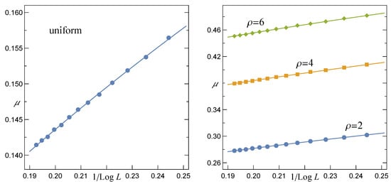 Only the best fits given by Equation (17) are shown in Figure 8 as a matter of transparency. When , the lines that represent arrays with different N intersect in a close vicinity of one point. This resembles the intersection point seen in Figure 1 that refers to the GLS rule. In contrast, lines stop crossing if and their positions together with mutual order reflect those corresponding to presented in Figure 2.