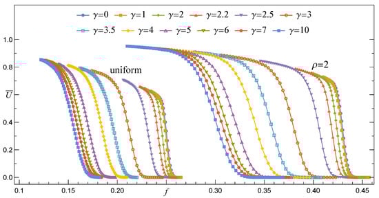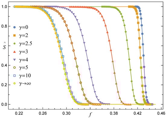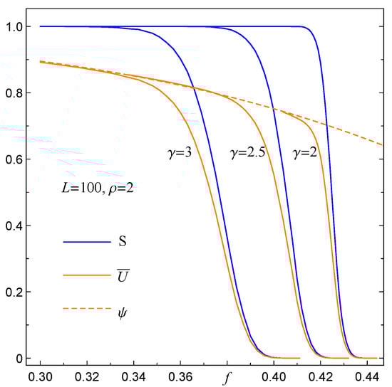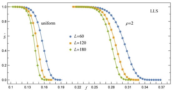 It is worth noting that the segment is shifted towards higher values of with respect to its counterpart [17], which is related to quasi-statically loaded systems [31,32,33]. This can be explained as follows. It is seen in Figure 5 that when we take a certain f and two surviving functions , then . On the other hand, when a given ensemble of arrays is loaded quasi-statically up to a certain load , then the fraction of surviving arrays would be greater than which results from the load being applied suddenly. Hence, having the same rule RV() in both loadings, we obtain the above-mentioned shift.