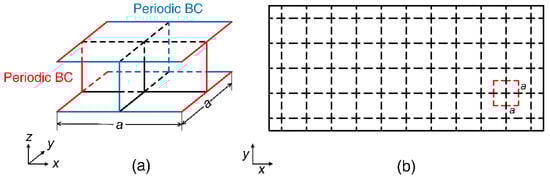 As shown in Figure 1, the unit cell of a 2D periodic DwG is composed of frames in the middle and plates on top and at the bottom, which separately correspond to the sizes of 100 × 40 × 2 mm and 100 × 100 × 2 mm. The grillages are made of structural steel: density , elastic modulus , and Poisson’s ratio . To calculate the band gap characteristics of infinite DwGs, the periodic boundary conditions of a grillage unit cell should be determined according to Bloch theorem so that elastic wave analysis can be transformed into an eigenvalue problem.