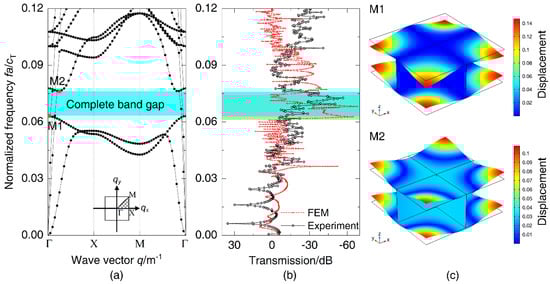 (a) Dispersion relations obtained in the path of the first irreducible Brillouin zone boundary, (b) vibration transmission spectra along the x-axis of manufactured and numerical models, and (c) wave propagation modes corresponding to M1–M2 in dispersion relations.