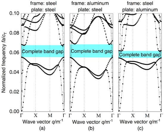 Dispersion relations of periodic (a) grillages with steel frames and plates, (b) grillages with aluminum frames and steel plates, and (c) grillages with steel frames and aluminum plates.