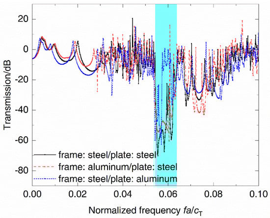 Based on the model in Figure 1, the material of the frames and the plates is individually substituted with aluminum to analyze the influence of material in different components on the complete band gap. The vibration band gap characteristics of all three models are shown in Figure 4, in which the original grillages with steel frames and plates are used as a reference and the material parameters of aluminum are as follows: density , elastic modulus , and Poisson’s ratio . Results indicate that the initial frequencies of the three band gaps are basically unchanged and there is some difference in terminal frequencies, which are reduced from 0.068 of grillages with steel frames and plates to 0.062 of grillages with steel frames and aluminum plates, leading to the bandwidth reduction from 0.012 of the original model to 0.007. It is obvious that the material change of plates has more influence on the complete band gap. In Figure 5, the transfer functions calculated by three numerical models of finite-length periodic structures show that the grillages with steel frames and aluminum plates have the narrowest bandwidth, in which the vibration attenuation effect is not as good as that in the other two models.