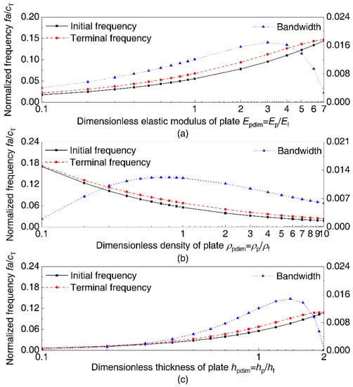 Influences of plate material properties on the complete band gap: (a) dimensionless elastic modulus, (b) dimensionless density, and (c) dimensionless thickness.