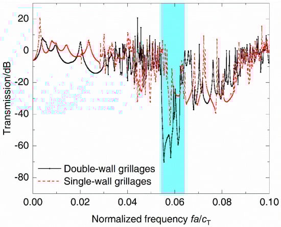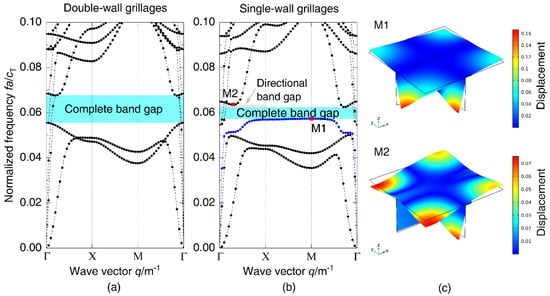 It can be seen that periodic DwGs have a complete band gap in 0–0.12 ranging from 0.063 to 0.076, which corresponds to the vibration attenuation domain in the transmission spectra of the manufactured and finite element models, as plotted in Figure 3a,b. Within the band gap of DwGs, the vibration transmission attenuation of the test model marked in the blue zone reaches more than 56 dB. However, there is a deviation between the model test result and the band gap calculation result of the finite element model. The main reason for the deviation is that the manufacturing process of small-size double-wall grillage structures leads to a difference between the test model and the ideal finite element model. Due to the damping effect of the structures, the transfer function of the experimental model has some attenuation in the high-frequency band. To illustrate the transmission characteristics of periodic DwGs more intuitively, parts of wave propagation modes under different wave vector conditions are plotted in Figure 3c, where M1 and M2 represent modes of initial and terminal frequencies of the band gap, respectively. Both M1 and M2 manifest as shear deformation of top and bottom plates, and furthermore, the vibration is mainly concentrated in the center of the plates, which is closely related to the formation of the complete band gap. Through band gap calculation and experimental verification, it is demonstrated that the complete band gap in periodic DwGs possesses great practical application value, so the analysis of the parameter influence will focus on the band gap.