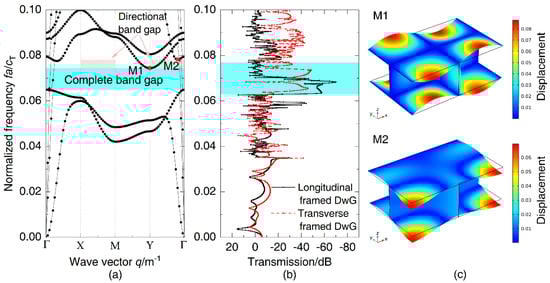 (a) Dispersion relations of periodic DwGs; (b) vibration transmission spectra of longitudinal- and transverse-framed DwGs; (c) wave propagation modes corresponding to M1–M2 in dispersion relations.