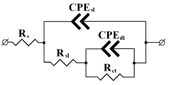 Impedance measurements were carried out under conditions similar to those used in the polarization experiments, in the same cell, and with similar electrodes. The measurements were carried out in the potentiostatic mode by applying a constant potential component equal to Ecor and a harmonic AC signal (amplitude = 10 mV) with frequencies from 100,000 to 0.1 Hz. The parameters of the equivalent circuit that adequately simulated the experimental impedance spectra were computed using the DCS program [19]. A modified Mansfeld circuit [20,21], where the capacitive elements were replaced with constant phase elements (CPE), was used in the simulations. This circuit type is widely used to simulate corrosion and the electrochemical behavior of metals with porous coatings and/or films (Figure 1) [22,23]: