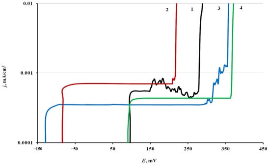 Polarization curves of St3 in borate buffer solution (pH 7.36) containing 0.001 M NaCl. 1: Without treatment with a CIN; 2: BTA; 3: ODA; 4: ODA + BTA.