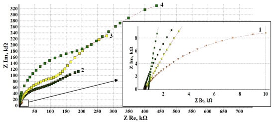 where A is a coefficient (modulus); j is the imaginary unit; ω is the cyclic frequency; n is the phase factor. Depending on the phase factor, the CPE element can be interpreted as a capacitor (n = 1), a Warburg diffusion element (n = 0.5), or a resistor (n = 0). With regard to the selected scheme, the value of the phase factor differing from unity can be used to judge how perfect the simulated capacitance is, how homogeneous its plates are, and how diffuse the charge distribution is.