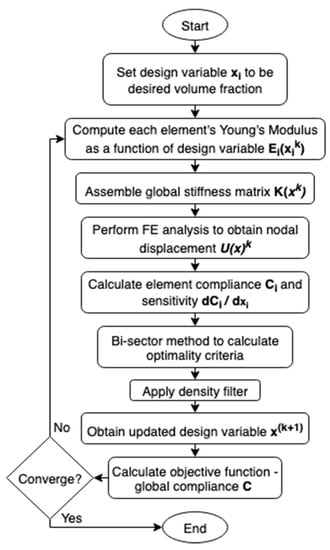 Equation (1) was used to derive the element stiffness matrix per unit Young’s modulus using the deformation matrix for a unit cube and constitutive matrix per-unit Young’s modulus . Equation (2) was used to calculate each element’s Young’s modulus as a penalised interpolation between a defined minimum and material’s Young’s Modulus based on its design variable and the chosen penalisation factor . Equation (3) was then used to compute each element’s stiffness matrix by multiplying the per-unit Young’s modulus stiffness by the element’s Young’s modulus. The sum of element stiffness matrices created the global stiffness matrix for that iteration. Standard finite element method steps were then taken to assemble the global force matrix and calculate nodal displacements .