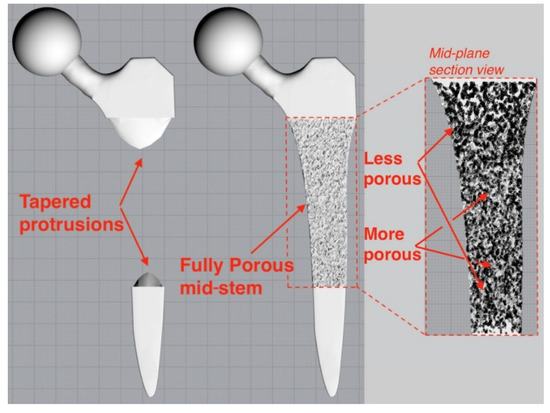 - Arabnejad, S.; Johnston, B.; Tanzer, M.; Pasini, D. Fully porous 3D printed titanium femoral stem to reduce stress-shielding following total hip arthroplasty. J. Orthop. Res. 2017, 35, 1774–1783. [Google Scholar] [CrossRef]