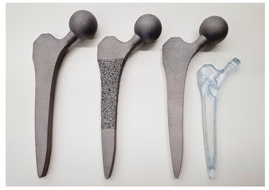 - Hanks, B.; Dinda, S.; Joshi, S. Redesign of the femoral stem for a total hip arthroplasty for additive manufacturing. In International Design Engineering Technical Conferences and Computers and Information in Engineering Conference; American Society of Mechanical Engineers: New York, NY, USA, 2018. [Google Scholar]
