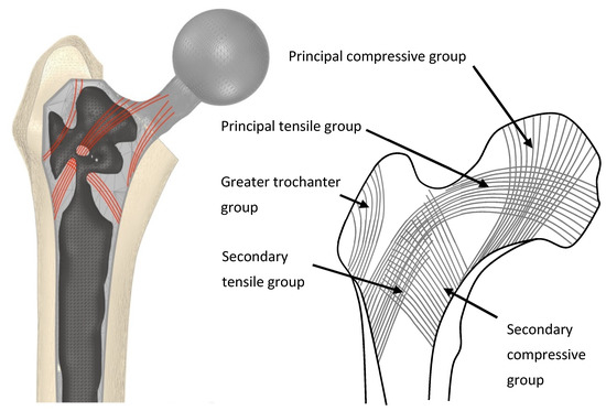 (Left) An example selectively hollowed stem implanted in a femur. Material remaining in the implant is indicative of the principal remodelling direction for trabecular bone in the femur (red lines). (Right) Representation of trabecular groups in the native femur.